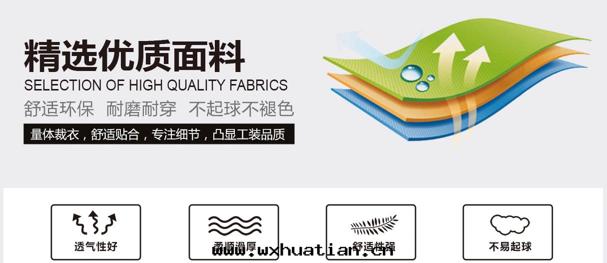 1:精選--高(gāo)級环(huán)保面(miàn)料 ,透气(qì)性(xìng)、吸汗(hàn)性(xìng)能(néng)高(gāo),觸感(gǎn)更(gèng)柔细(xì)。